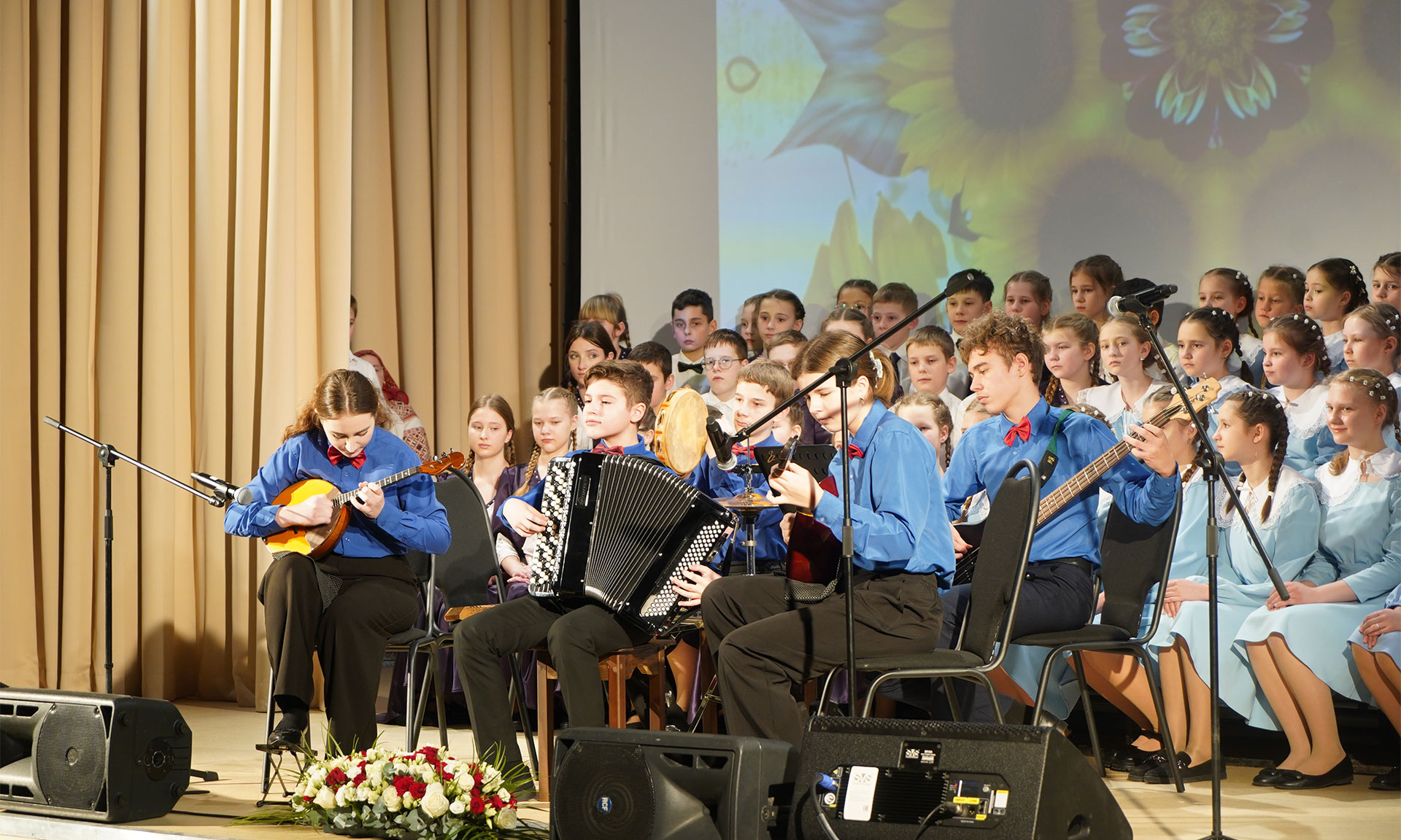 Музыкальное приветствие для гостей в обновленном концертном зале исполнили детский фольклорный ансамбль «Лукошко», учащиеся ДШИ № 10 и хоры.
