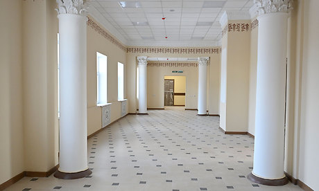 Самая тяжелая и сложная работа позади: укреплены несущие конструкции здания — стены и перекрытия, обновлен фасад, сделана новая кровля, заново проложена электрика, водопровод, канализация. Александр Богомаз вместе с Петром Глыбочко осмотрели все четыре этажа.